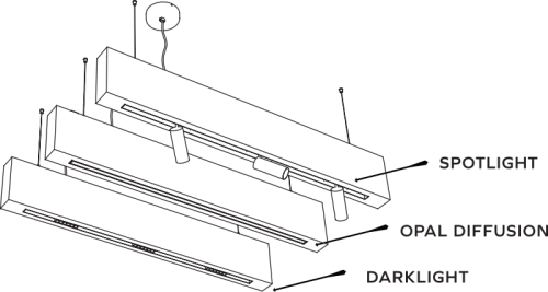 Cette baffle acoustique peut recevoir en option 3 types de luminaires ( spotlight, opal diffusion ou darklight).