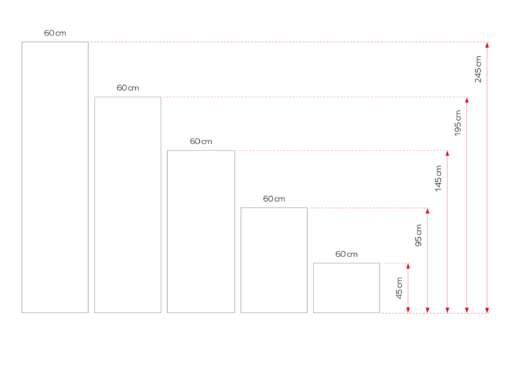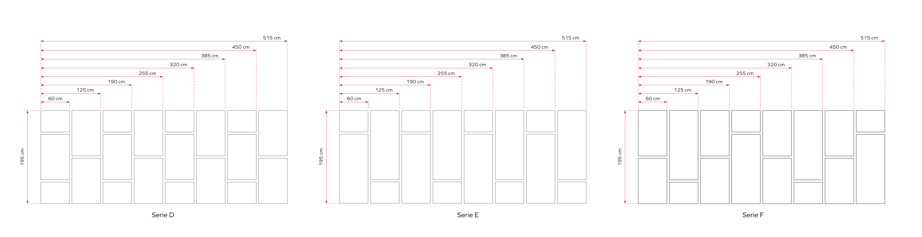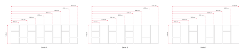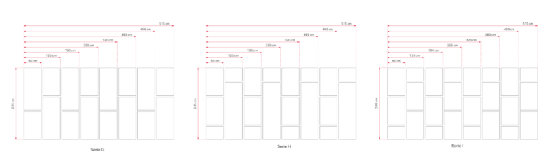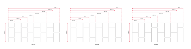 Il est possible de réaliser des compositions avec une hauteur totale de 148, 200 ou 252 cm (hors fixations) et 5 tailles de panneaux à assembler.